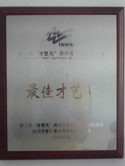 2009年11月:参加了第二届“智慧鸟”杯幼儿英语才艺大赛荣获:《最佳才艺奖》《最佳人气奖》