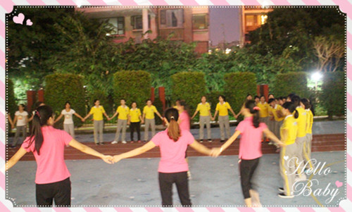 游戏“爱的抱抱”老师们就像一家人一样手拉手围成一个圆,意味着同
