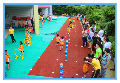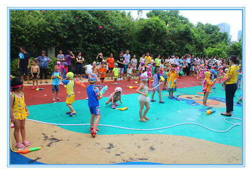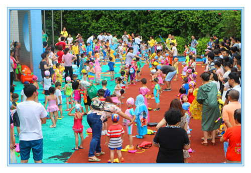 家长早上八点入园参观,参观了幼儿早操,体能大冲关活动,区域游戏和集体教学,并且和孩子们一起参与了亲子水枪大战游戏。