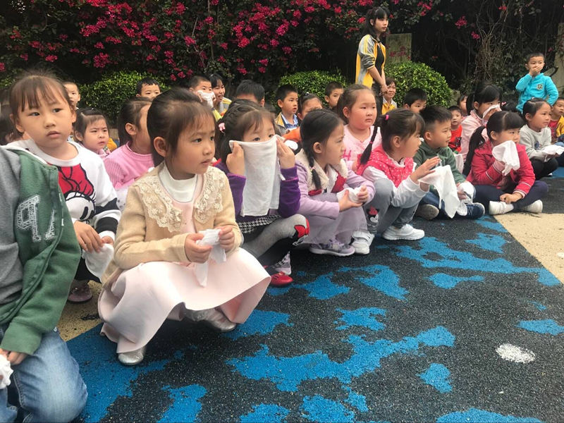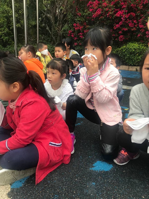 警铃响起,小朋友们拿着湿毛巾掩住口鼻,跟着老师有序逃离到安全的地方。