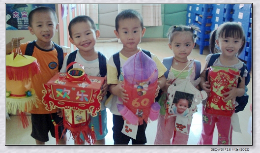 通过本次“庆国庆·迎中秋”花灯比赛活动促进了亲子互动,美化了幼儿园的园舍环境,丰富了幼儿园民间艺术课题活动,更为祖国母亲60华诞献上节日的祝福!