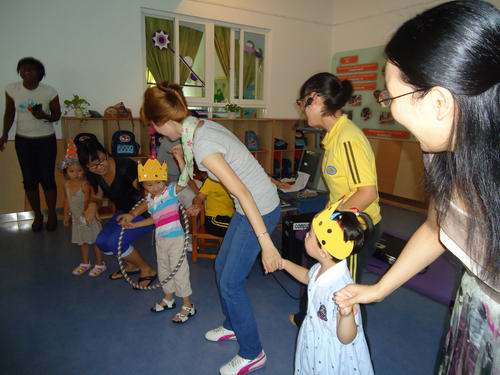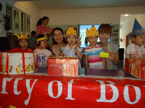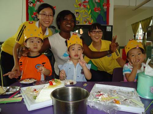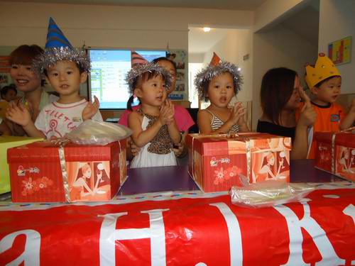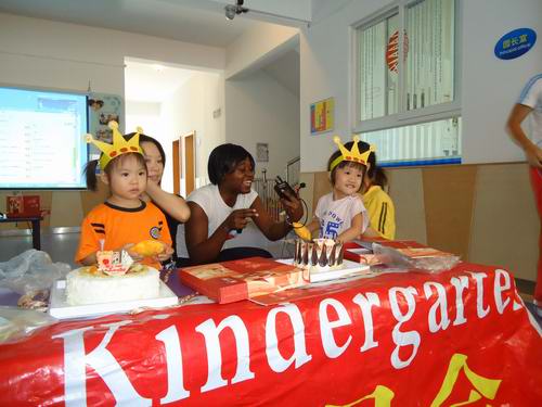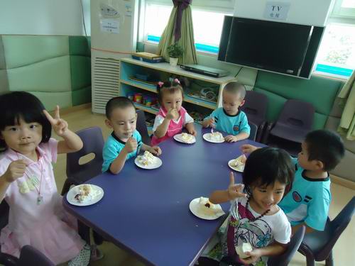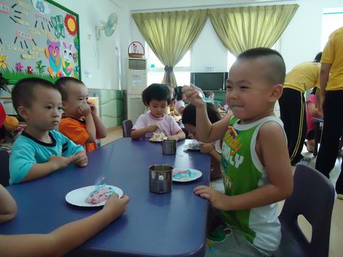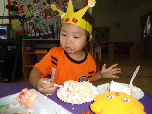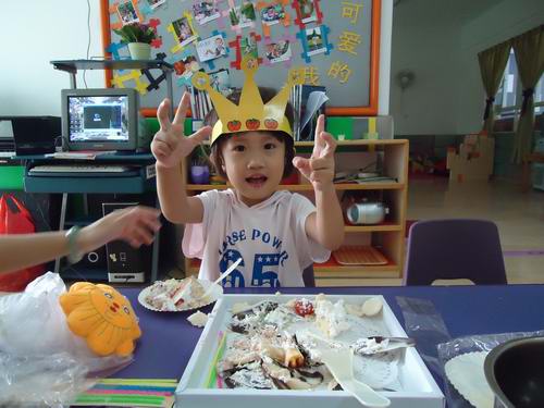 和小伙伴们一起分享蛋糕:“我们很开心,yeah!”