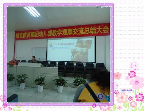 博雅教育集团幼儿部于2010年10月12日至21进行了为期8天的内部半日观摩活动,在此基础上为了不断提高教师专业水平,增强专业技能,加强集团内部员工的交流、学习,我园全体教职工于2010年11月20参加了由集团组织的教学观摩交流总结会,会上9个集团的园长根据观摩后的各种感想结合自身优势和实际对幼儿教育教学中出现的问题进行了有针对性的培训讲座,集团的姚董事长和领导们也利用此次机会跟员工一起交流、学习。