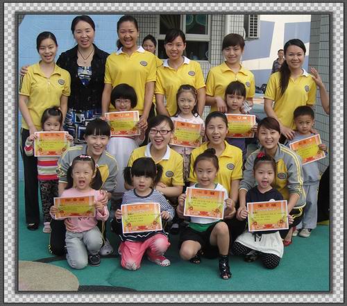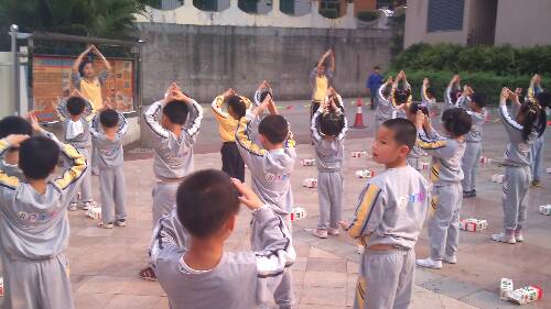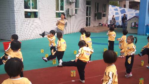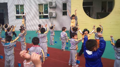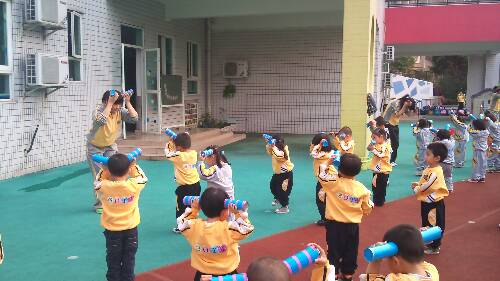 为锻炼幼儿身体,提高幼儿做操质量,4月8日早上我园举行了全园幼儿的早操比赛活动。瞧!孩子们和老师穿着整齐的园服,精神抖擞,踏着欢快的音乐,迈着有力的步伐,开始准备比赛了,听,音乐响起了。。。我园的早操从音乐的选择到动作的编排都投入了老师很大的精力,特别是各班的器械操,所用器材都是老师、家长和孩子们运用周边资源及废旧材料共同制作的,美观、耐用、环保并极具特色。