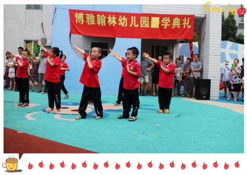 在散学典礼中,进行了庄严的升旗仪式、热闹而有趣的班歌比赛、园长妈妈致辞并颁发本学期“全勤宝宝”等奖项,大班小朋友们还表演了精彩的武术节目。每个班级也分别以唱歌、舞蹈、游戏等多种形式向家长展示了这学期宝宝在园所学教学及生活知识。看着孩子们的进步,家长们既欣慰又为宝贝们的成长感到骄傲,赞不绝口。