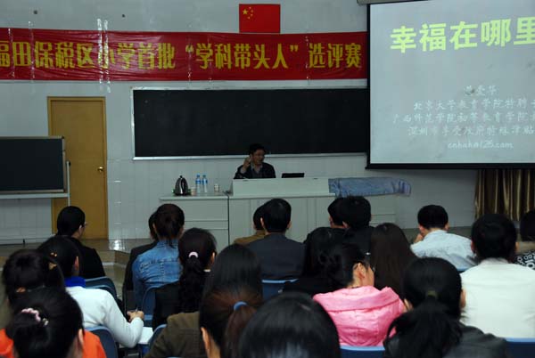 2月22日晚6点,应博雅教育集团邀请,深圳市福田区教师培训中心主任黄爱华到我校举办了专题讲座,博雅教育集团所属的福田保税区小学、益田花园小学、康桥外国语学校的教师们参加了此次培训。 黄爱华主任此次讲座的题目是《幸福是什么》,从做个幸福的教师,享受职业幸福的角度阐述了一名优秀教师的成长条件、成长过程和成功标准。他认为,一个有幸福感的人,要“拥有自己的梦想和创造性生活”,并“生活在自己的作品中”。而作为一名教师,要从“对教育的研究”中获得幸福感。这种研究贯穿了教育的全过程,包括对教育现象的分析、对教育问题的解决、对教育经验的总结,最后形成自己的研究成果和教育个性。 在谈到如何做一个受学生欢迎的老师时,黄爱华主任认为,教师应是渊博的、幽默的,要懂得肯定学生,赏识学生,在日常教学中创造有意义的经典,以积极的行为影响孩子的一生。只有这样,才能成为孩子心目中的好老师,从而在平凡的工作中获得幸福感 黄爱华主任的讲座紧贴教师的工作和生活实际,深入浅出,语言幽默生动又极尽真诚,不时引起教师们会心的笑声和掌声。整个讲座持续了两个半小时,气氛融洽而热烈。 此次讲座是我校对教师进行系列培训的一部分。从本学期开始,我校将邀请更多名师莅临讲座,传授经验,为深化教育改革提供动力。 |