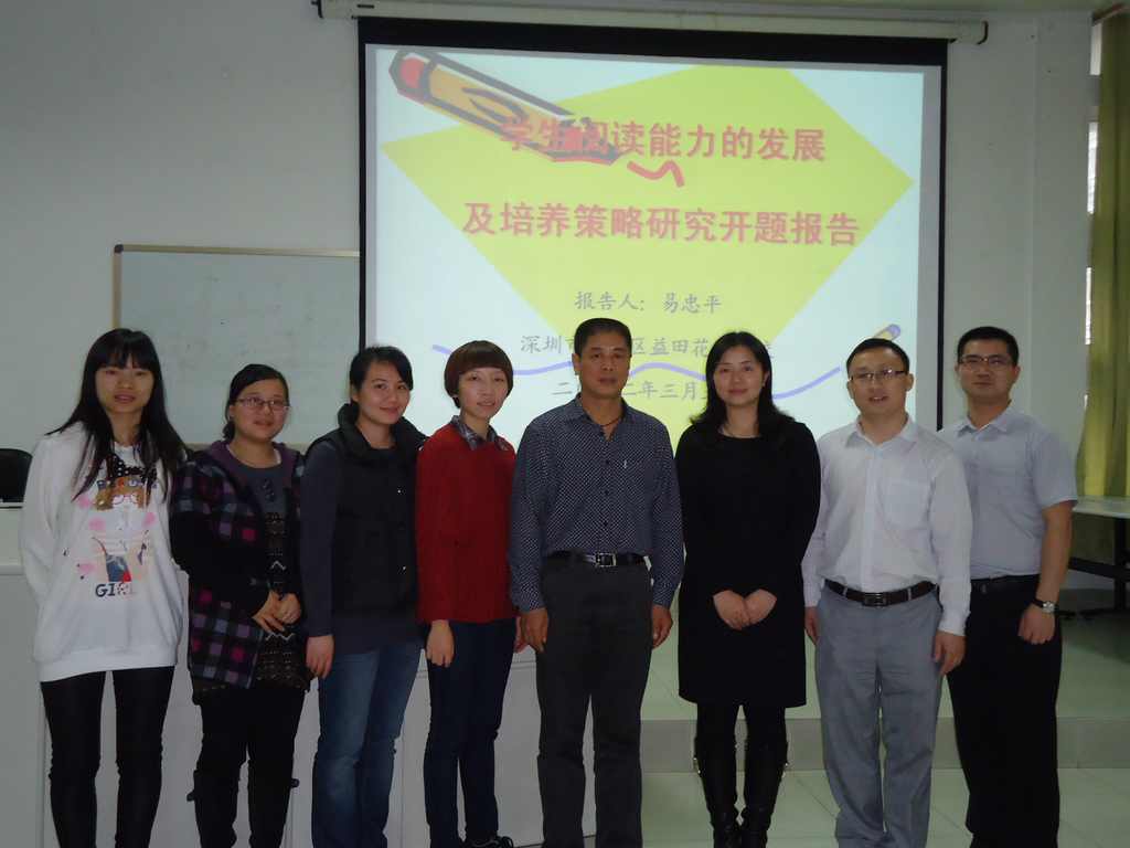 2012年3月5日下午4:30分,益田花园学校召开公益性科研项目《学生英语阅读能力的发展及培养策略研究》课题的开题报告会,福田区教育科研中心徐素倪副主任、福田区教育局民管科杨珺科长出席了本次会议。 会上,首先由益田花园学校胡怀均校长致欢迎辞,福田区教育局杨科长宣读课题立项书。接着,课题组项目负责人易忠平主任陈述课题开题报告,区教育局徐主任结合我校课题存在的问题,紧密联系学校实际情况和需求,为我们深入浅出地讲解了如何做好学生英语阅读研究的问题,给予了具有很强实效性、针对性的指导,对于我校进一步搞好研究提供了最及时、最有效的帮助。 最后,胡校长对课题研究作出了表态发言。本次的公益性课题的研究是益田花园学校为真正意义上实现素质教育作出的初步尝试。以下是区领导与我校课题组全体成员的合影。 |