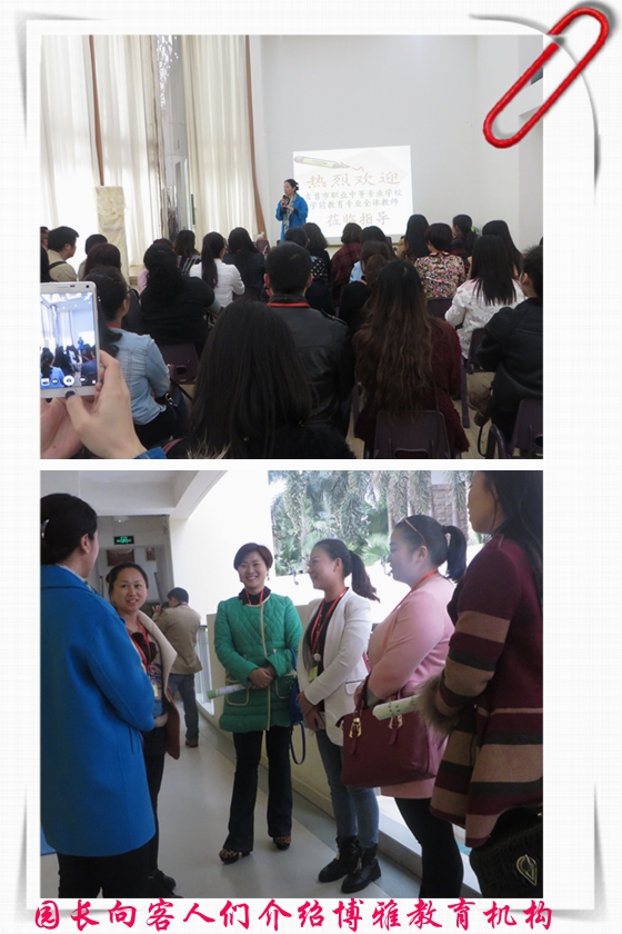 2015年1月7日,湖南省吉首市职业中等专业学校学前教育专业的41名教师莅临我博雅教育集团属下的金域蓝湾幼儿园参观和交流学习。石春兰园长代表集团对远道而来的老师们表示热烈的欢迎,并介绍了博雅教育集团及属下各学校幼儿园的基本情况和各自的特色。老师们参观了金域蓝湾幼儿园的环境创设,观摩了各班的区域游戏活动,并听了杨亚莉老师一堂语言示范课。 金域蓝湾幼儿园优美的环境创设、生动有趣的教育教学活动及温馨的人文环境得到了大家的好评,给前来参观的老师们留下了深刻的印象。此次活动为吉首和深圳两地的幼儿教育搭建出友谊和成长的平台,促进了博雅集团与专业学校教师的交流,更好地提升了教师的专业素养和幼儿园的办园品质。
