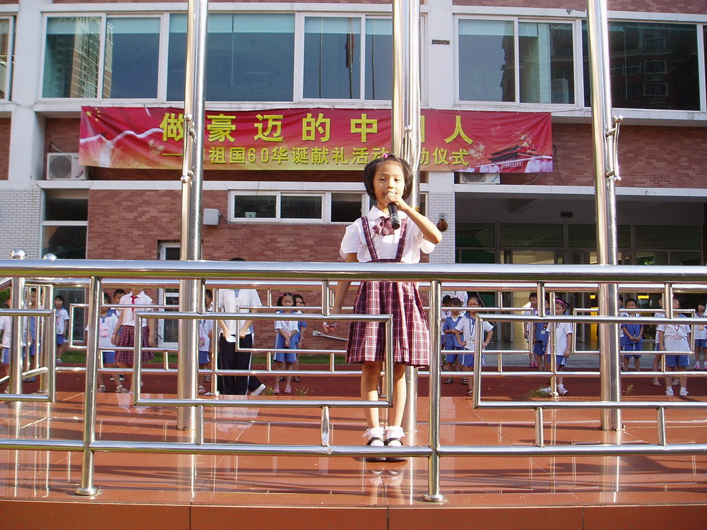 2009年9月23日上午,我校全体师生在操场举行了“做豪迈的中国人——想祖国六十华诞献礼活动仪式”。上午8:00,在《今天是你的生日,我的祖国》歌声中,启动仪式正式开始。各年级的学生代表、老师代表分别以自己的方式表达对祖国母亲生日的祝福和对祖国的热爱。最后,杨校长作了激情洋溢的讲话,同学们在校长的带领下齐声高呼:“做豪迈的中国人”向祖国母亲致敬!